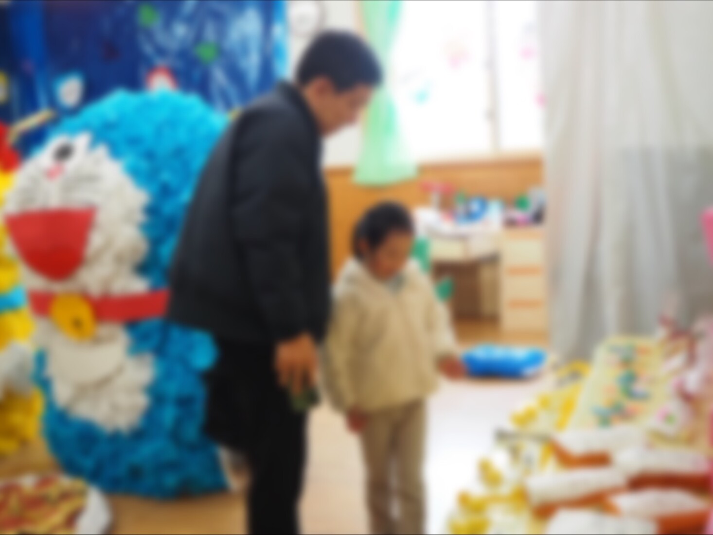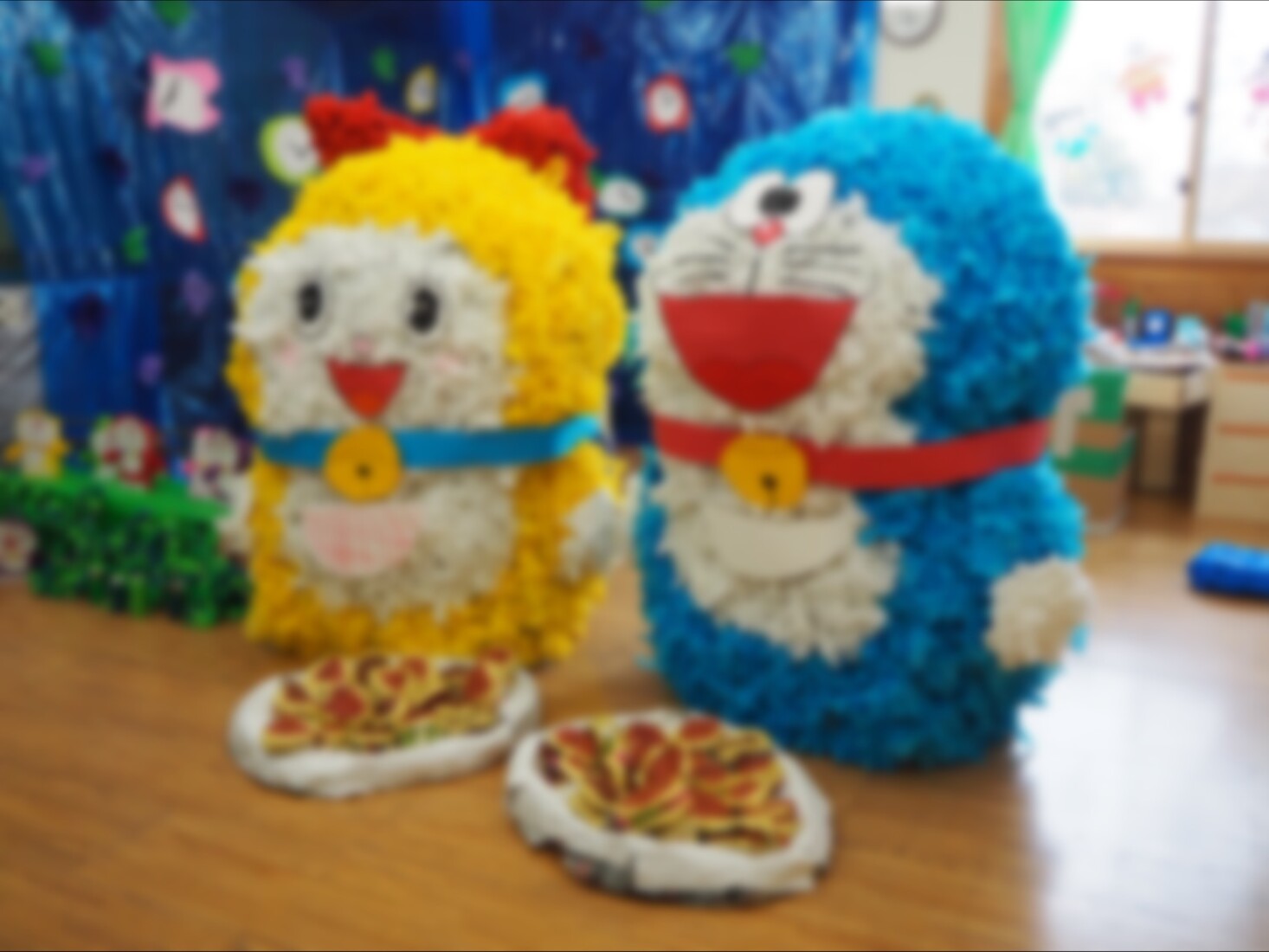 年長さんの共同製作「ドラえもん」は、いろいろな場面があり、また、実際にタイムマシーンに乗ることができた