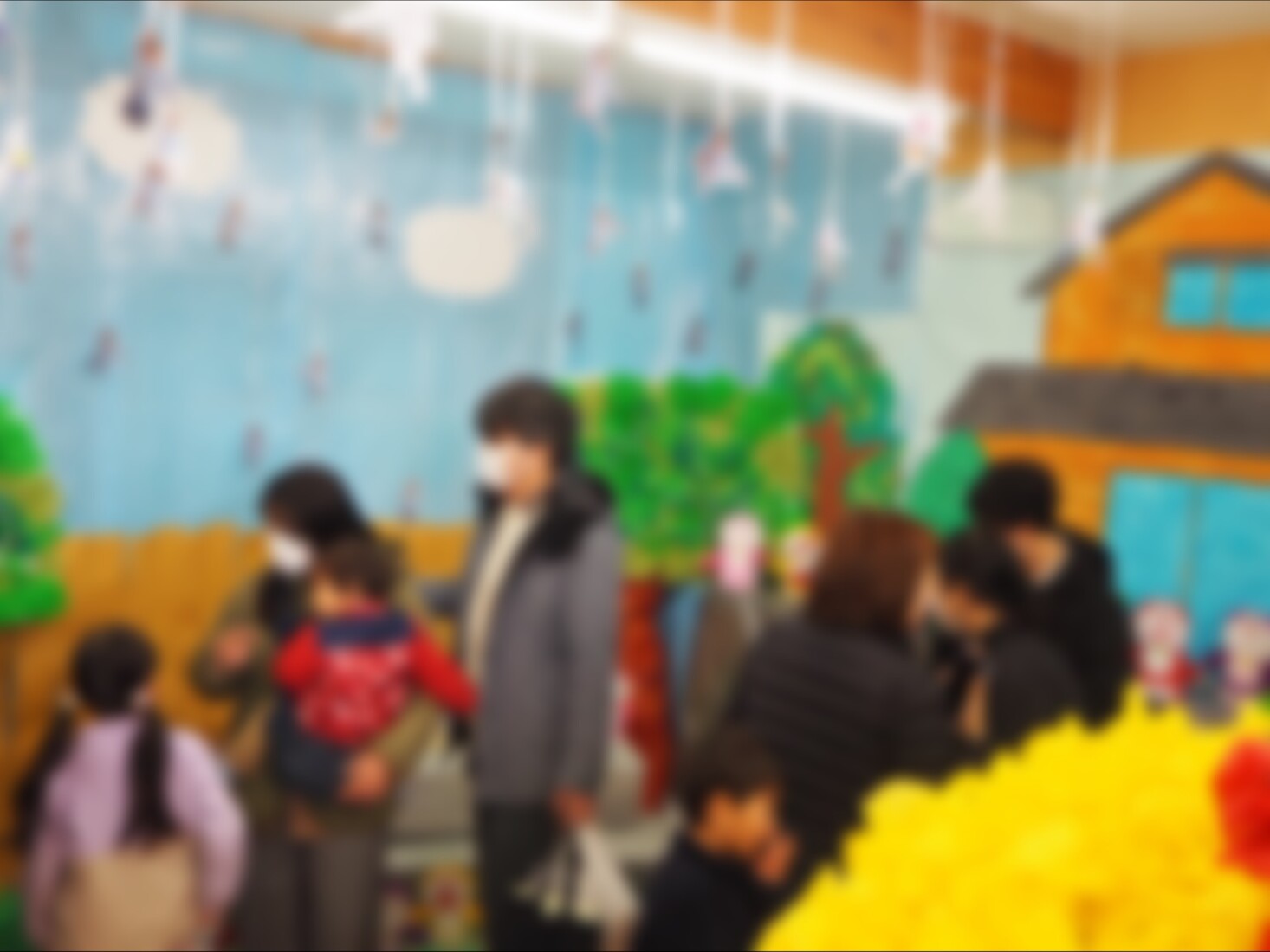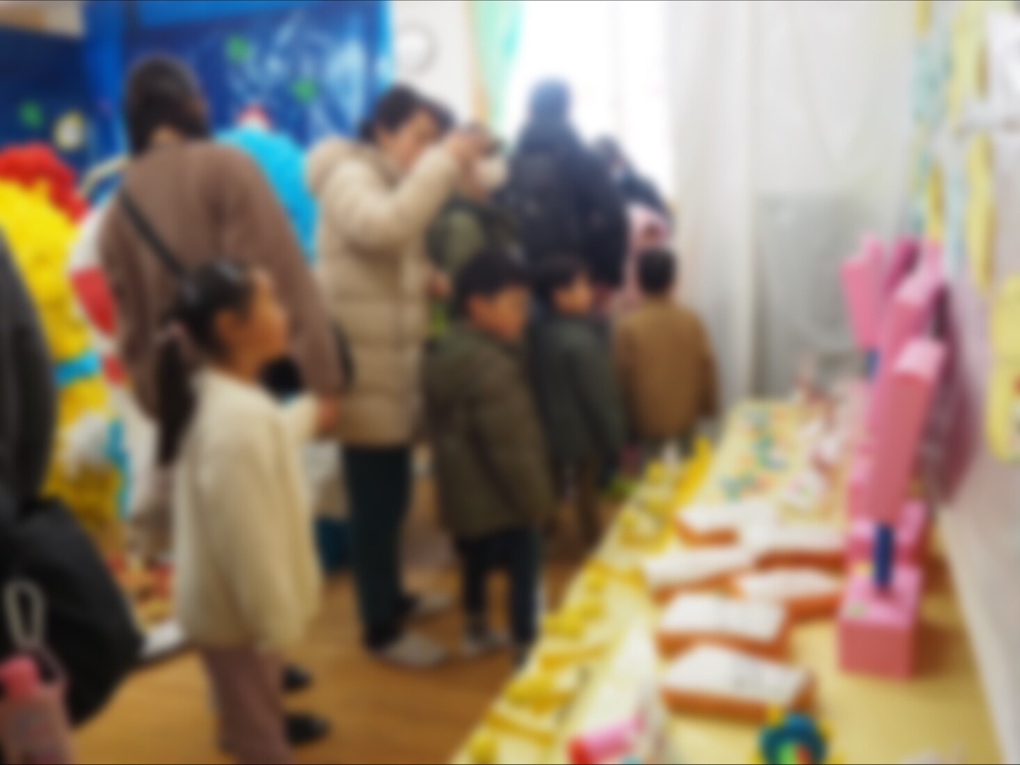 年少さんは、自由画や紙粘土・スチレン版画・ビー玉転がしアート等、年中さんは、自由画や紙粘土・お話の絵・にじみ絵等と、ひとりひとり個性や成長がみられる作品でした。